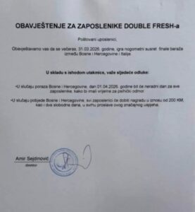 Jedna lokalna firma je čak dala slobodan dan svojim zaposlenima u slučaju da Bosna izgubi, da bi se oporavili od poraza, a u slučaju pobjede daće im dva slobodna dana i po 100 eura da bi mogli na nezaboravan način da proslave plasman na Svjetsko prvenstvo!